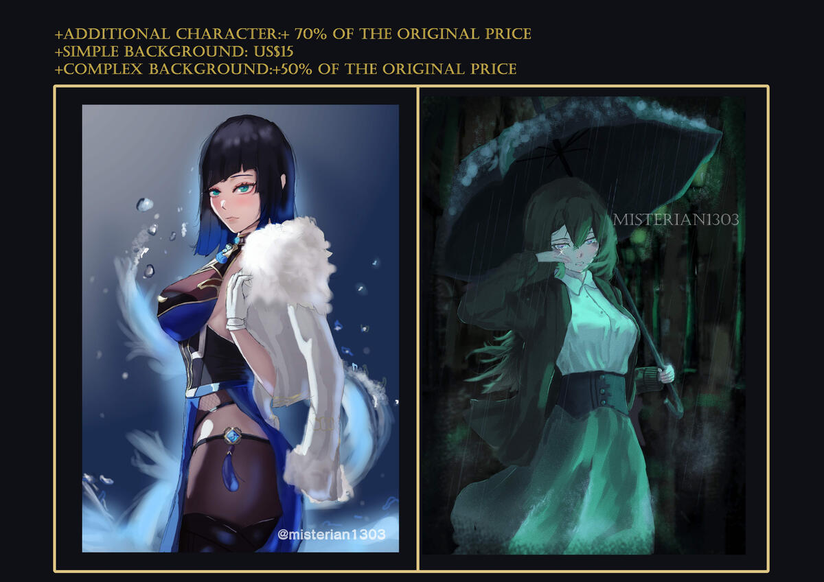 Please also note that depending on the complexity of the character, additional charges may apply and this is applicable to any type of commission. |